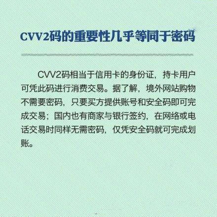 银 行工作人员提醒,信用卡上的关键信息一定要保护好。信用卡背面位于签名处的末3位数字,也被称为 CVV码或CVC码,经过发卡银行的编码规则和加密算法生成。一般来说,这3个数字式唯一的,用来识别个人身份,在支付过程中,尤其是非现场支付,如果商家将“后三位”提供给银行,银行会默认为商家取得了持卡人的授权而允许交易。