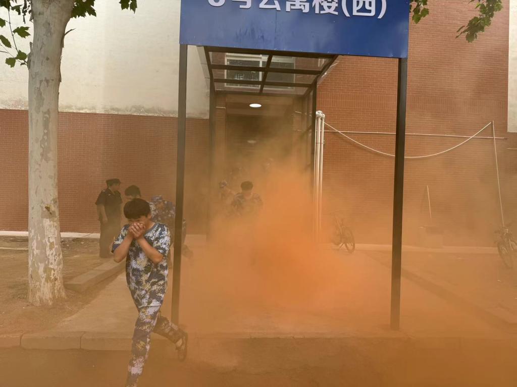 随着“起火了!”,一阵“浓烟”从学生宿舍楼冒出,伴随着警报声响起,同学们迅速进入紧急状态。首先,学生们在老师和楼管的指导下,用湿毛巾捂住口鼻,弯腰低姿,按照预定疏散路径迅速有序地逃离宿舍楼。楼内疏散人员按照预先的消防演习方案疏散学生,保证楼内学生的安全,以免慌乱中出现拥挤或者踩伤现象。