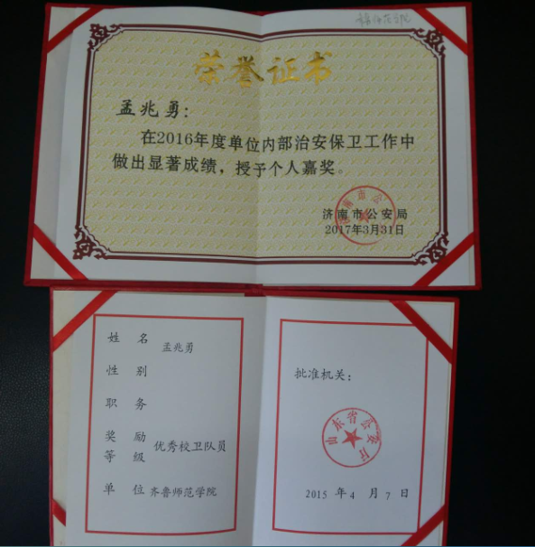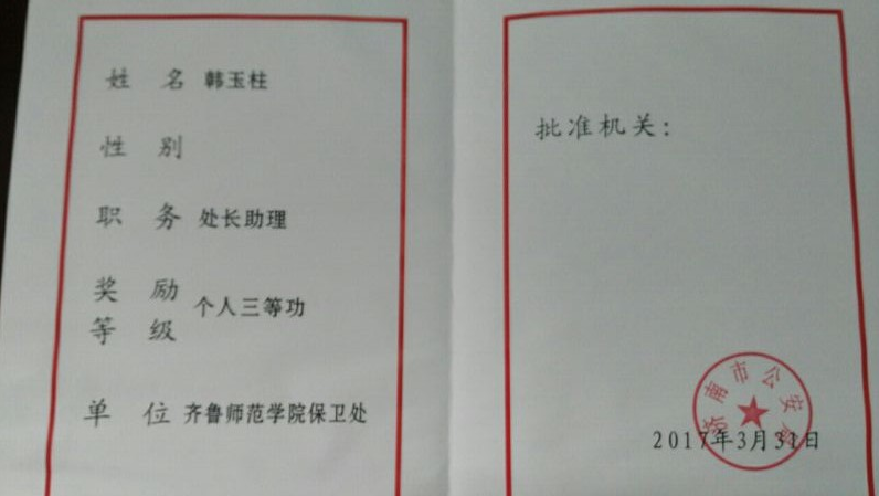 近日,为表彰先进、树立典型,济南市公安局《关于表彰2016年度全市单位内部治安保卫工作先进集体和先进个人的决定》,我校保卫处韩玉柱同志荣获全市单位内部治安保卫工作个人三等功一次。同时,孟兆勇同志获得个人嘉奖。