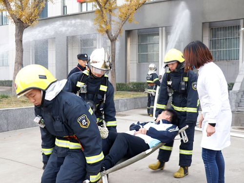 在消防演练现场,中控室值班人员通过自动报警系统发现学院综合楼四楼有火情报警,值班人员立即启动“5.30.60”应急处理机制,四楼安全负责人迅速赶到现场确认火情并反馈中控室。随后拨打报警电话,由于火情较大,救援组成员立即赶赴现场进行扑救。同时,带队辅导员及班干部利用扩音器和闪光棒对被困学生进行有秩序的疏散。此时,三辆消防车到达现场,消防指挥员到中控室询问火情后,迅速命令53米云梯消防车占据有利地形展开升起营救被困人员。25吨重型水罐车占据室外消火栓做好灭火准备。警戒小组做好现场警戒。搜救小组携带担架等救援装备,迅速深入着火建筑内部解救被困人员并负责打开下风口窗户,实施自燃排烟。8吨水罐车停靠在综合楼西侧。由第一灭火攻坚组携带灭火器材及单干线水枪两支,一组进行外控灭火,另一组进行内攻灭火。在消防队员的紧密配合下内攻人员携带救援装备成功将三楼被困人员救出,五楼被困人员由消防人员对被困者进行了安全防护,利用云梯车迅速将被困人员送至地面。楼内被困师生全部救出,未造成人员伤亡。在消防官兵和师生们的共同努力下,采取内外夹击,内攻人员展开扑救迅速,火势被彻底消灭,将火灾损失降到了最低。最后由指挥员下达命令确定现场无危险后撤离现场。